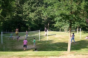 Grote familiecamping in het bos. De toeristische plaatsen liggen gescheiden van de vaste plaatsen op door bomen omzoomde rustige velden. Het zwembadterrein heeft twee grote baden...