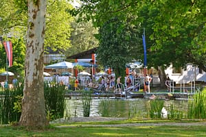 Rustige camping op de oever van een meer met afgebakende plaatsen door de talrijke beplanting en waar vele vormen van watersport mogelijk zijn. Verwarmd zwembad met glijbaan.
