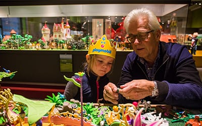 PLAYMOBIL is in vier decennia voort blijven groeien. De historie van het populaire speelgoed wordt gepresenteerd in een fantasierijk decor, dat jong en oud meevoert in de tijd en de veranderende speelwerelden van PLAYMOBIL. Overdonderend voor kinderen zijn de circa vijftig levensgrote PLAYMOBIL figuren. Grote diorama’s van PLAYMOBIL verzamelaars tonen intrigerende miniatuurwerelden. Talrijke speeltafels nodigen uit tot onbeperkt speelplezier.