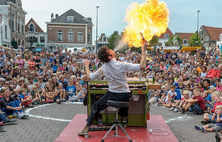 De Gillende Keukenprins is als enige op deze wereld in het bezit van het Keukenorgeldrumgestel: koken, orgel spelen en drummen tegelijk…een eitje! In deze fysieke voorstelling die het midden houdt tussen theater, circus en een rockconcert, draait het allemaal om het bakken van één pannenkoek. Rondvliegende ingrediënten, verse beukende muziek, een vlijmscherp koksmes als stuwer in een intieme ode en uiteindelijk na een storm van zevenentwintig-en-een-halve minuut is ‘ie’ daar; De Pannenkoek