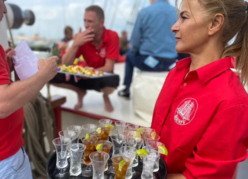 - 11.45u – 15.20 uur Prachtige zeiltocht over het Marker- of IJsselmeer. Actieve meezeilers krijgen uitleg over het dwars en langs getuigd zeilen, knopen leggen, navigeren en je kunt zelfs achter het roer staan. Als passief meezeiler biedt Bounty deze mensen één van meerdere lounge kussens aan, waardoor zij heerlijk op het dek ontspannen kunnen genieten van de elementen van het zeilen met een lekker hapje en/of drankje.
