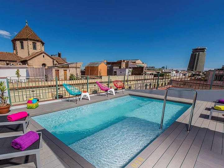 Gratis fietstour onbekend Barcelona (beperkt beschikbaar), La Rambla op steenworp afstand, Slapen in comfortabele kamers, Verzorgd ontbijtbuffet, Ontspannen op het dakterras, Afkoelen in het zwembad & inclusief transfers.