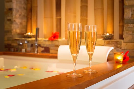 Wat is nu romantischer dan samen met een glas bubbels in een heerlijke warme jacuzzi vol rozenblaadjes en lekker geurende aroma!