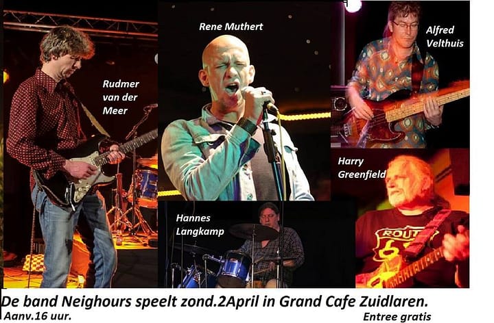Aanstaande zondag 2 april 2017 komt de Groningse blues- en rockformatie Neighbours spelen bij Grand Café Zuidlaren. De band bestaat uit: Rene Muthert (Vocals) Rudmer van der Meer (Lead Guitar) Harry Greenfield (Guitar) Alfred Velthuis (Guitar) Hannes Langkamp (Drums). Rap, house en drumcomputers? Dit zijn woorden waar Neighbours nog nooit van gehoord heeft. Authenticiteit is het sleutelwoord van deze groep en dat is te horen ook! Stuk voor stuk zijn de leden van de Groningse groep puristen te noemen. Ze kunnen hun muzikale voorliefde met hart en ziel uitvoeren. Voor elk bandlid geldt, dat ze reeds lang met de blues bezig waren voordat ze tot Neighbours toetraden. Hoewel de groep voornamelijk covers speelt, hebben ze ook eigen nummers in hun repertoire. Met 200% inzet brengen ze stevige bluesrock ten gehore. Aanvang 16 uur, iedereen is welkom, de toegang is gratis.