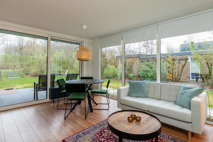 De kleine maar fijne accommodatie is van alle gemakken voorzien. Via de entree stap je binnen in de ruime keuken voorzien van kookplaat, magnetron, oven, vaatwasser, koelkast met vriesvakje, vriezer, waterkoker, nespresso- en filterkoffiezetapparaat. Direct aan de keuken staat de gezellige eethoek met ronde tafel en zitplaatsen voor 4 personen, vanaf de eettafel kijk je direct op de mooie achtertuin. Grenzend aan de grote raampartijen, met tevens uitzicht op de tuin, staat de zithoek met tweepersoonsbank en losse fauteuil en flatscreen televisie. De woning is functioneel ingericht met een warm en huiselijk gevoel, leuk detail; de schilderijen zijn persoonlijk geschilderd door de eigenaar.