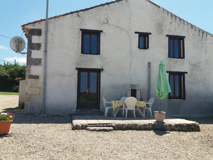 Omgebouwde schuur met 2 slaapkamers, badkamer en grote open leefruimte met salon, eethoek en keuken. Privé terras met BBQ, tafel en stoelen.