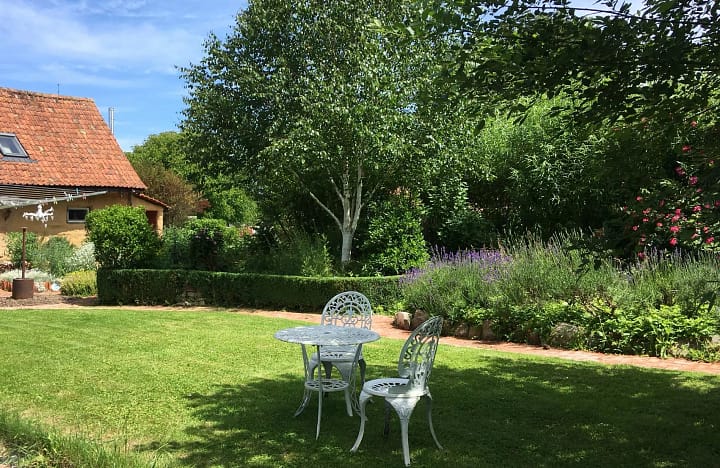 – Extra eettafel en stoelen buiten cottage (en andere gedeelde tafels in de tuin)