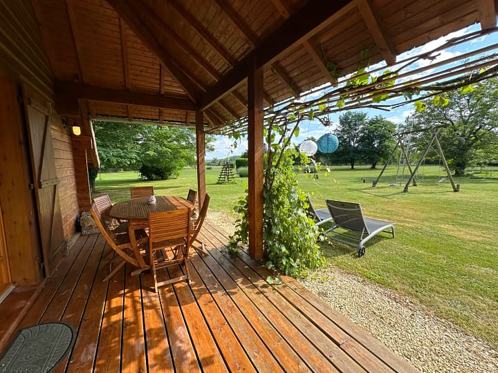 U heeft buiten een overdekte veranda met zithoek en barbecue en veel ruimte met een mooi uitzicht.