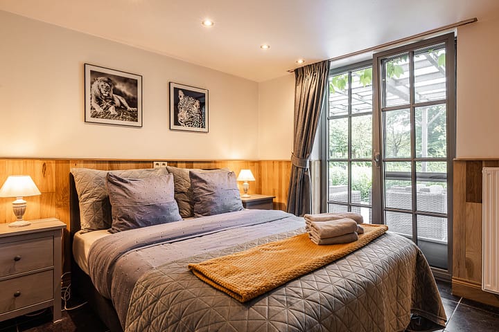 Hier geniet je van de warme gloed van de ondergaande avondzon en een schitterend uitzicht op de beek, waar het charmante brugje overheen ligt. De kamer beschikt over een eigen overdekt terras, ideaal om te ontspannen en van de natuur te genieten.