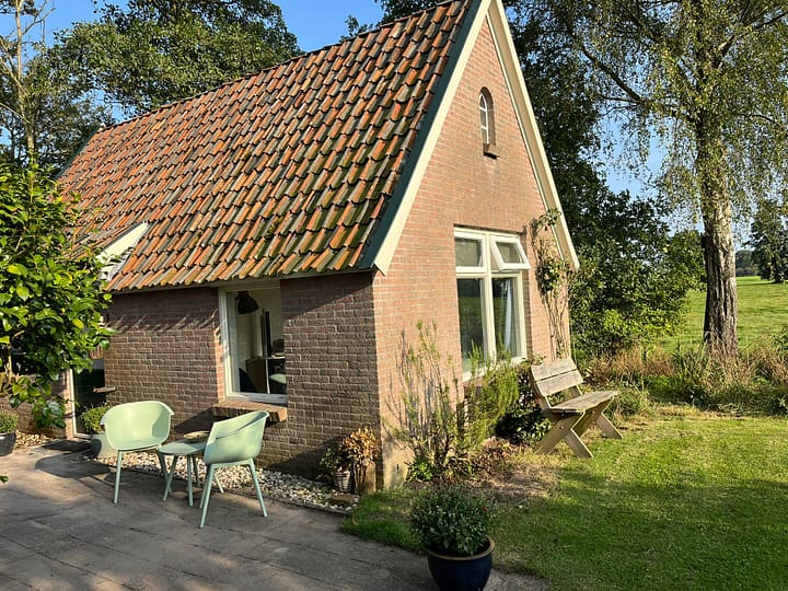 Wakker worden naast de koeien van de buurman. De weilanden liggen om het huisje heen.