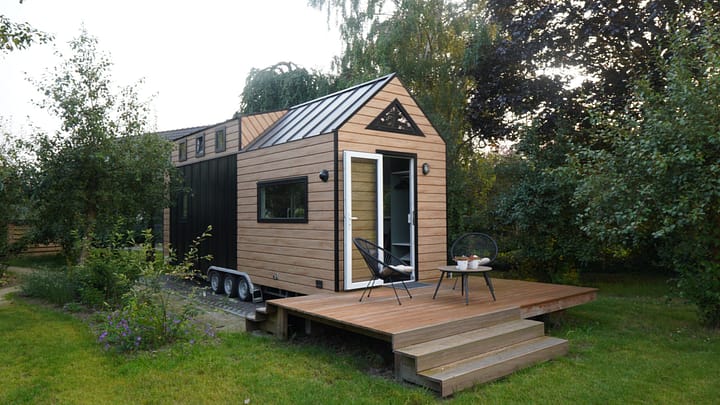 Het Tiny house beschikt over een eigen voordeur die te bereiken is via het paadje in de boomgaard en wordt betreden via de vlonder voor het huisje.