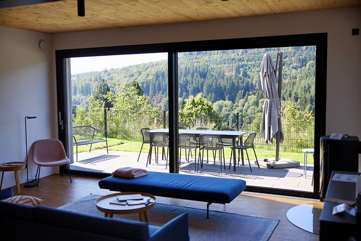 De lodge bestaat uit zes architectonisch verfijnde vakantiewoningen met een hoge mate van kwaliteit en flexibiliteit in een natuurlijk ensemble. Als groep voor een kookweekend of seminars voor bedrijven, als bergsporters, voor een familievakantie of gewoon voor een weekend met vrienden, de Sauerland Lodge biedt voor iedereen de juiste indeling. De ruime woon/eetkamer met open haard vormt het centrum van het 120 m² grote huis. Hier nodigt de goed uitgeruste keuken uit om samen te koken. Op de begane grond bevinden zich ook de sauna met douche en een gastentoilet. Op de bovenverdieping zijn 3 slaapkamers, waarvan 2 met een tweepersoonsbed. Eén slaapkamer is ingericht met 2 eenpersoonsbedden en een alkoofbed (0,80×1,80) met ruimte voor 2 kinderen. Er is een badkamer met douche en een ruime badkamer met ligbad. Late check-out inbegrepen: op zondag is vertrek mogelijk tot 12 uur 's middags.