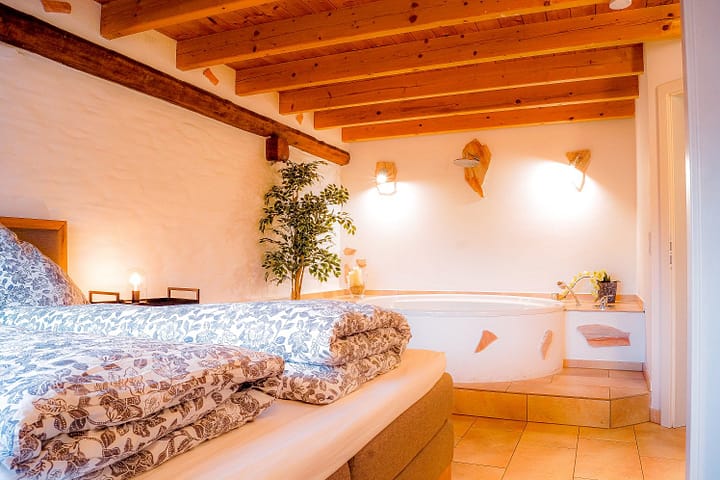 Deze mooie, hoogwaardig ingerichte vakantiewoning “Spirit” strekt zich uit over twee verdiepingen en heeft veel bijzondere kenmerken: Whirlpool, fitnessruimte, sauna, zonneterras en een prachtig uitzicht over de manege naar de Münstermaifelder velden – hier wordt uw vakantie een paradijs.