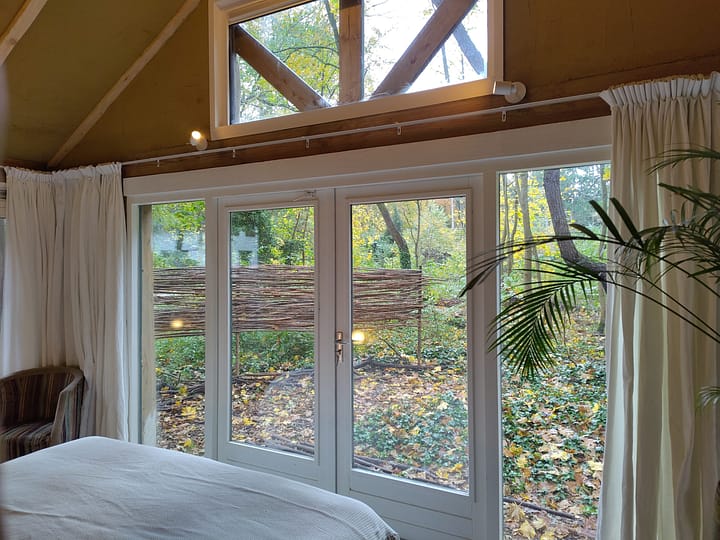 Onze tuinkamer is onderdeel van de carport en heeft toegang tot een eigen gedeelte van de tuin. hierdoor kun je volledig privé genieten van vogels en het bos. Het is een slaapkamer met een badkamer en kan evt geboekt worden in combinatie met onze tiny die bestaat uit een slaapkamer en een woonkeuken. Door het vele glas kun je zomers en winter genieten van het bos. Door de natuurlijke bouwmaterialen is het comfortabel en erg prettig verblijven. Er is mogelijkheid tot het zetten van koffie en thee en het maken een klein ontbijt.