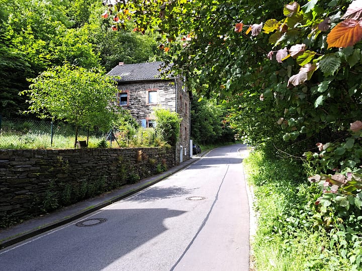 klein typisch eifels huisje, net om de bocht Monschau, eenvoudig te bereiken en parkeren, met klein gezellig terrasje.