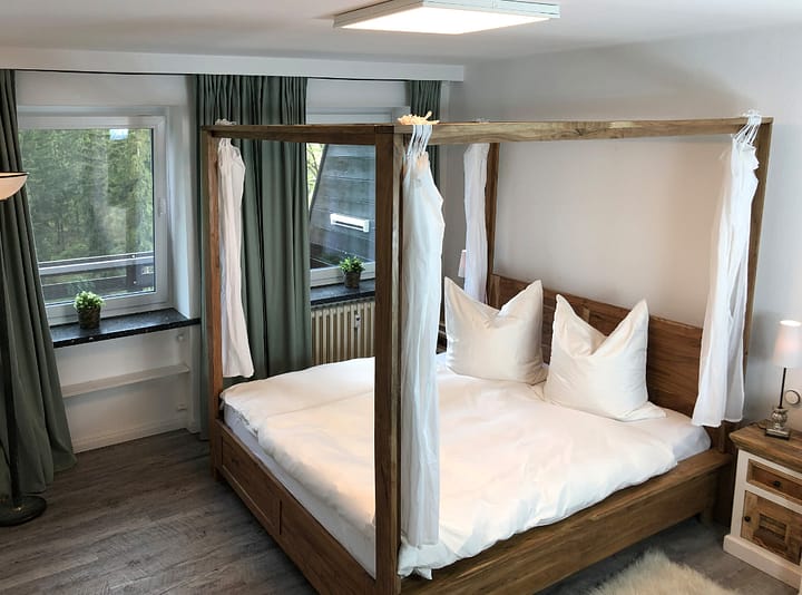Als je in de natuur wilt zijn en wilt genieten van rust en stilte, dan is dit de juiste plek voor jou. Ideaal voor gestreste mensen, natuurliefhebbers, wandelaars, sportievelingen, stelletjes of hondenbezitters. De vakantiewoning “Nartura” biedt een moderne en stijlvolle inrichting voor ontspannen dagen. De flat is ruim bemeten met 64 vierkante meter en biedt genoeg ruimte voor 4 personen. Er is een kinderbedje in de slaapkamer, waardoor het mogelijk is voor 5 personen om te verblijven. De slaapkamer heeft een gezellige, moderne “shabby chic stijl” met een 180 cm breed hemelbed voor rustgevende nachten voor 2 personen. Een groot balkon van 14 vierkante meter met vrij uitzicht op het open landschap op het zuiden nodigt je uit om te ontspannen en te zonnebaden in de zomer. In het koude seizoen of voor gezellige avonden zorgt de pelletkachel in de woonkamer voor een behaaglijke sfeer met een vuurtje. De bank in de woonkamer kan worden gebruikt als een slaapbank van hoge kwaliteit met lattenbodem. Met zijn breedte van 160 cm biedt hij twee extra slaapplaatsen.