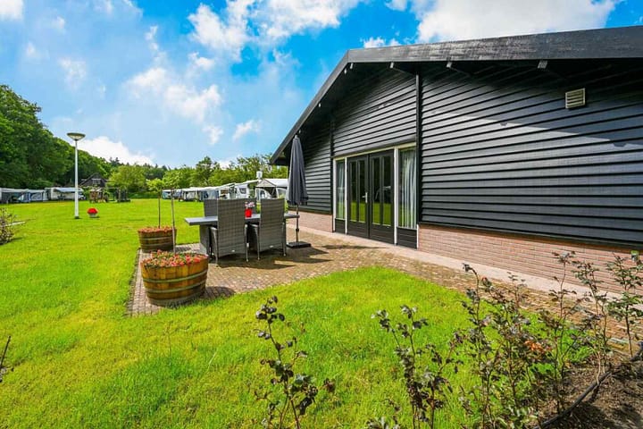Woonkamer met een eethoek en zithoek met tv, modern ingerichte open keuken. Op de begane grond is er een slaapkamer met een tweepersoonsbed en een badkamer met douche, badmeubel en toilet. Op de mezzanine bevindt zich de tweede slaapkamer met twee éénpersoonsbedden. Buiten heeft u een heerlijk zonnig en gezellig terras met tuinmeubilair en uitzicht over de minicamping.