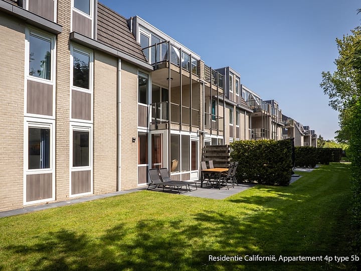 Dit appartement type 5B heeft een privé sauna en ligt op de begane grond. De woonkamer heeft een zithoek met tv, radio en cd-speler. Ook is er een eethoek. De open keuken is ingericht met 4-pits elektrisch comfort, vaatwasser, koelkast met vriesvak en magnetron. Er zijn twee slaapkamers met een tv en comfortabele bedden. De badkamer beschikt over een ligbad, wastafel, toilet en aparte douchecabine. Dit appartement heeft een terras. Tuinmeubilair is aanwezig.