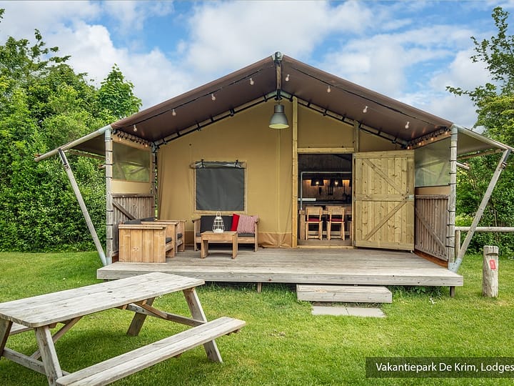 Glamping op Texel! De ruime lodges zijn geschikt voor 6 personen en compleet ingerichte glampingtenten! Echt alles is aanwezig: Een compleet ingerichte keuken, comfortabele zithoek met (petroleum) kachel, gezellige eethoek, speelruimte voor de kinderen, een eigen badkamer met douche en toilet. Je slaapt op comfortabele bedden. In deze Safari Lodge zelfs in een hemelbed! De kinderen slapen in een bedstede. Op het houten terras is het heerlijk vertoeven tot de late uurtjes. Dit is kamperen…maar dan net even anders!