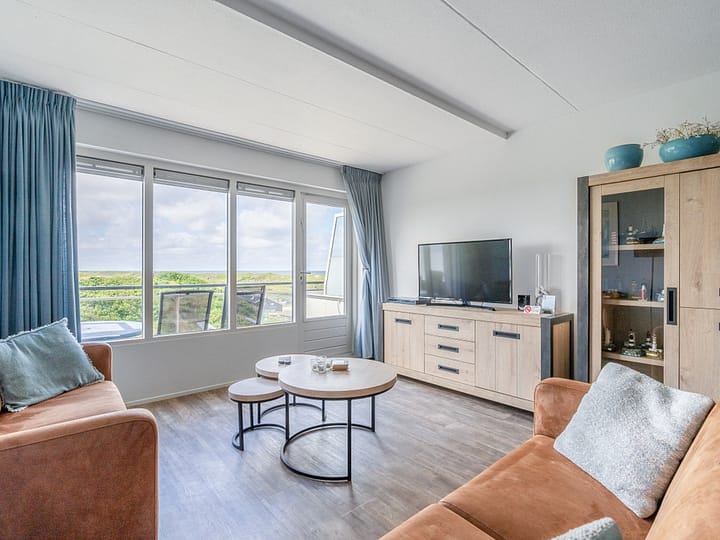 Zeezicht appartement op de 1e etage. Entree, ruime woonkamer, voorzien van een zithoek met TV en een eethoek met eettafel voor 4 personen. De nette open keuken is van alle gemakken voorzien zoals een vaatwasser, combimagnetron, koelkast met vriesvak en verschillende koffiezetapparaten. Er zijn 2 slaapkamers aanwezig. Eén slaapkamer is voorzien van een comfortabel 2-persoons boxspring bed, de andere slaapkamer is voorzien van twee comfortabele 1-persoons boxspring bedden en is gelegen in het midden van het appartement waardoor er geen raam met zicht naar buiten aanwezig is. De badkamer is uitgerust met een ligbad, douche en een wastafel. Het toilet is apart gesitueerd. Het balkon is op het zuiden gelegen en biedt een prachtig uitzicht over de Noordzee, de duinen en badplaats de Koog. Tuinmeubilair is standaard aanwezig.