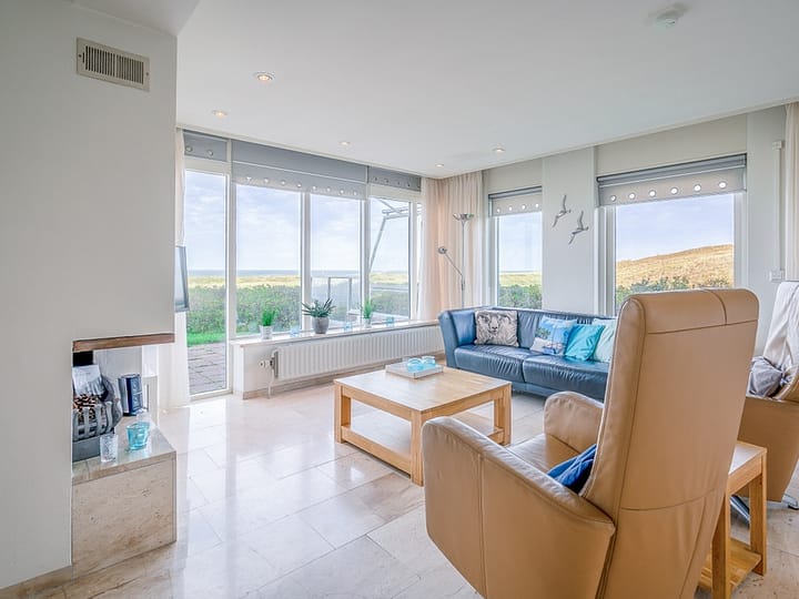 Riant hoek appartement, entree, wooknamer met een panorama uitzicht over het nationaal park ‘de duinen van Texel’. Zithoek met tv en een ruime eethoek met eettafel voor 4-personen, Vanaf de eettafel heb je ook nog een prachtig uitzicht over de Noordzee. De nette open keuken is van alle gemakken voorzien zoals een vaatwasser, combimagnetron, koelkast met vriesvak en verschillende koffiemachines. De slaapkamer is voorzien van een 2-persoons bed met twee 1-persoons matrassen en een tv. De badkamer heeft een ligbad, aparte douche (met smalle ingang) en een twee wastafels. Het toilet is apart gesitueerd. Vanaf het terras heb je een prachtig weids uitzicht over de Noordzee en nationaal park ‘de duinen van Texel’ . Tuinmeubilair is standaard aanwezig.