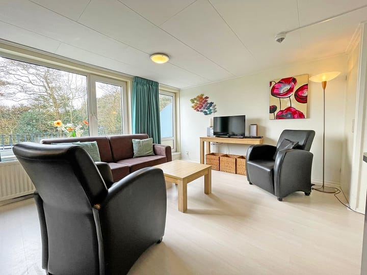 De woonkamer is voorzien van een zithoek met tv. Er is een eethoek. De open keuken is ingericht met een koelkast, vaatwasser, koffiezetapparaat, Nespresso, waterkoker en magnetron. Een trap vanuit de toegangshal brengt je naar de slaapkamers. Er zijn twee slaapkamers met elk 2 eenpersoons boxspringbedden. De badkamer heeft een douche, wastafel en toilet. Dit appartement ligt op de 1e etage, heeft een balkon en uitzicht over de weilanden en naar het bos.