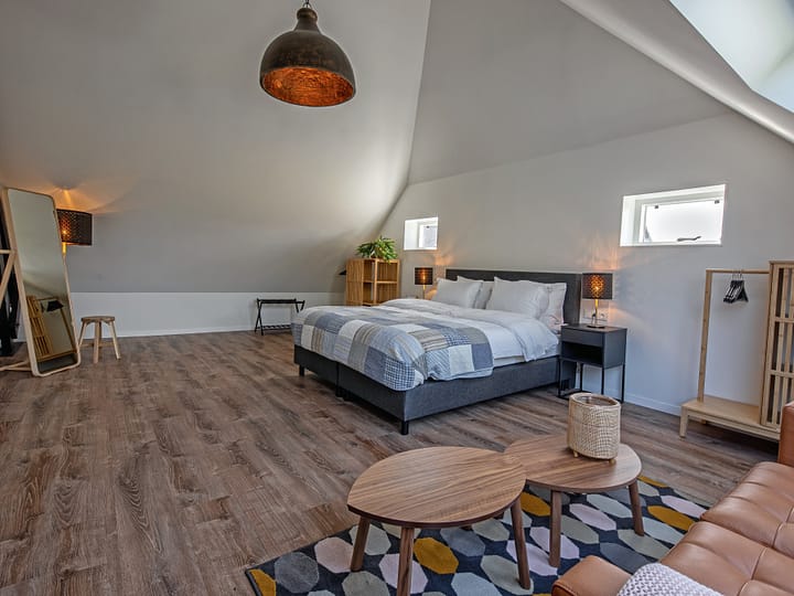 De comfortabele Michiel de Ruytersuite ligt op de eerste verdieping, de voormalige hooizolder. Het karakteristieke hoge plafond is behouden en vormt samen met de originele houten spanten een mooi decor. De ruime kamer (60m2) heeft een zithoek, Smart-TV, een Bose audiosysteem en een ensuite badkamer met inloop regendouche en heerlijke Rituals producten. Op de kamer zijn een Nespresso koffieapparaat en theefaciliteiten aanwezig. Je slaapt op een kingsize boxspringbed. Je kunt gebruikmaken van tuin met terras, De tuin heeft een weids uitzicht over de typische Texelse velden tot aan de Hoge Berg bij Den Burg.
