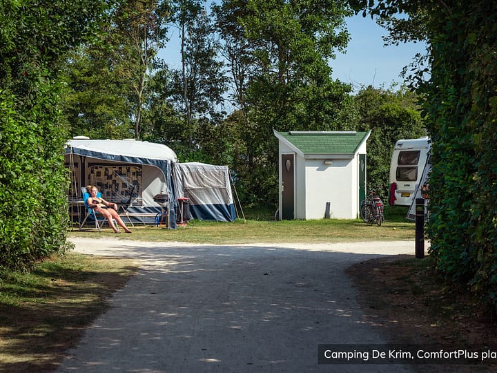 Deze Comfort-plus plaats heeft eigen sanitair en is gelegen aan de rand van het park, naast het Krimbos. De Comfort-plus plaats met elektra (10 ampère) is bestemd voor het plaatsen van een tent of caravan of met een bijzettent (max. 4 m²). Deze plek heeft privé sanitair (douche, wc en wastafel) op de plek. Ook beschik je over kabeltelevisie-aansluiting, water- en rioolaansluiting .