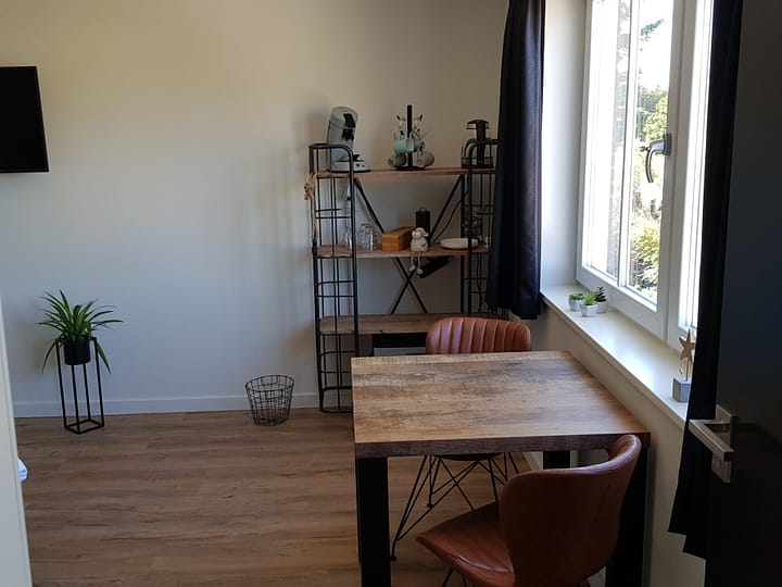 Kamer De Mient ligt op de eerste etage. De kamer heeft een tweepersoonsbed, zitje, smart-tv, koelkast, waterkoker en Senseo. De badkamer heeft een inloopdouche, wastafel en toilet. De drie kamers in B&B Westerduinen zijn ingericht met een ‘industriële touch’.