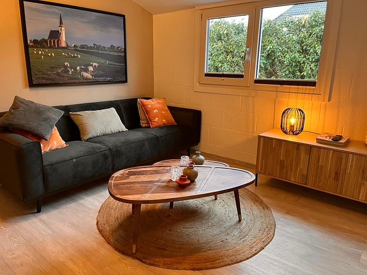 Entree, gezellig woon/eetkamer met zithoek, eethoek en flatscreen tv. In de open keuken vind je o.a. een vaatwasser. De slaapkamer heeft 2 eenpersoons bedden. De badkamer heeft een wastafel, douche en toilet. Je hebt een eigen, omsloten tuintje met zitje en uitzicht op de landerijen.