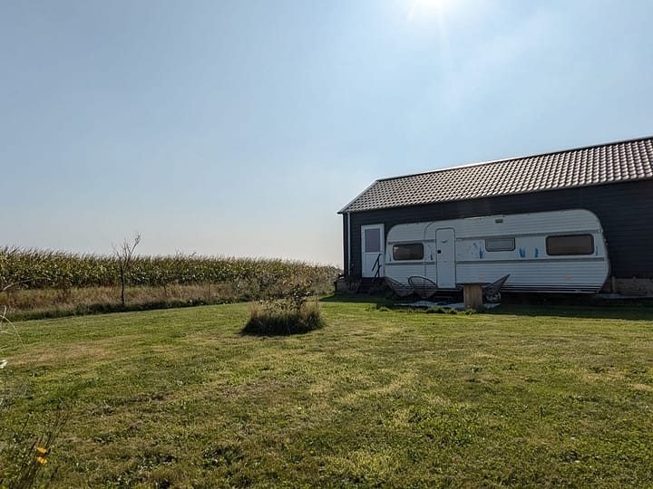 In de caravan is een 1 persoons + 2 persoons vast bed aanwezig. Er is een verwarming / ventilator in de caravan aanwezig. Er is geen kook-mogelijkheid in de caravan , maar er kan in het algemene gedeelte van de BnB gebruik worden gemaakt van een combi-magnetron, eierkoker en andere faciliteiten. Rondom de caravan is een jonge boomgaard met zitje. BBQ-en/open vuur is buiten toegestaan, tenzij er een droogte-alarm geld op het eiland.