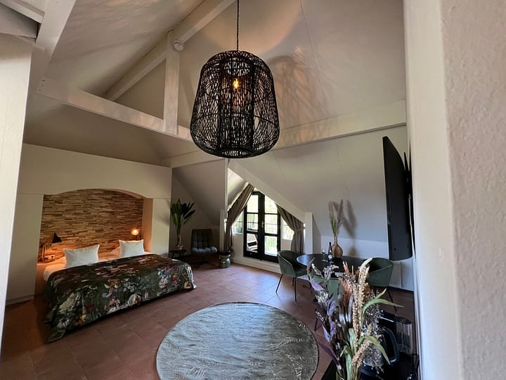 Een 2-persoons riante suite op de eerste verdieping (te bereiken via trap). In deze kamer vind je een extra hoek waar je comfortabel kunt vertoeven op de bank of twee heerlijke lounge stoelen. Dimbare verlichting in de robuuste lampen geven extra sfeer. Grote ronde tafel met comfortabele stoelen, ook ideaal om aan te werken. De badkamer is voorzien van een bad en aparte douche.
