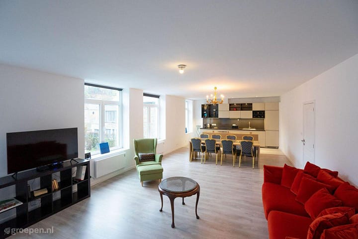De ruime woonkamer heeft door de grote ramen een lichte uitstraling en is voorzien van een smart TV. Hier staat ook een eettafel die voldoende plaats biedt voor het gehele gezelschap. De open keuken is voorzien van alle faciliteiten zoals; een elektrisch fornuis met 4 pitten, een koelkast met vriezer, magnetron, oven en een afwasmachine. Deze accommodatie is verbonden aan een voormalige bioscoop die volledig gerenoveerd is tot een multifunctionele ruimte. Het is mogelijk deze kamer apart te boeken, evenals een extra studio in hetzelfde gebouw. De accommodatie is voorzien van vier tweepersoonskamers, twee doucheruimtes en een sauna, waar je even heerlijk kunt ontspannen. Beddengoed & badhanddoeken zijn aanwezig.