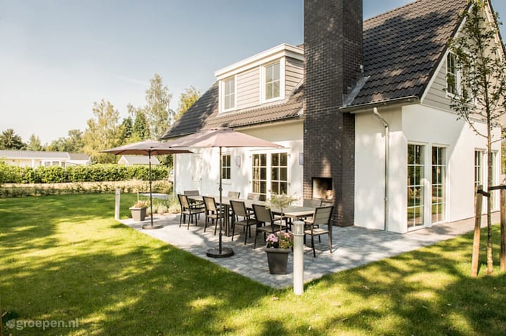 Hier kun je samen met je familie en vrienden genieten van de royale woonkamer met openslaande deuren naar de tuin, een sfeerhaard, eetkamer en open keuken met kookeiland. De slaapkamer beneden beschikt over een eigen badkamer. Ontspan op het terras bij de buitenhaard. De villa is gelegen op een eigen grondstuk, op een rustig en mooi groen vakantiepark.