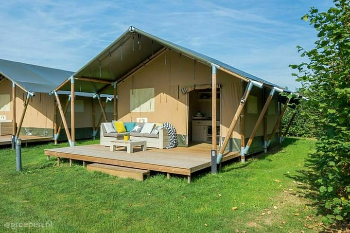 Luxe kamperen doe je in de 6-persoons safaritent. Met de stoere tent-look, van binnen en buiten, beleef je de ultieme glamping ervaring. Het gevoel van kamperen, gecombineerd met de luxe van een bungalow. De robuuste en ruime tenten bevinden zich op het campinggedeelte van het park en beschikken over een eigen badkamer met een douche, wastafel en toilet. Bij mooi weer geniet u op de veranda met steigerhouten meubilair en op de koudere dagen kan je binnen de warmte opzoeken dankzij de kachel. De safaritent beschikt over een compleet inventaris, zoals o.a. een keuken met een combimagnetron, koelvriescombinatie en 4-pits gasstel, een leuke houten eettafel en twee slaapkamers. De ene slaapkamer heeft twee eenpersoonsbedden, de andere twee stapelbedden.