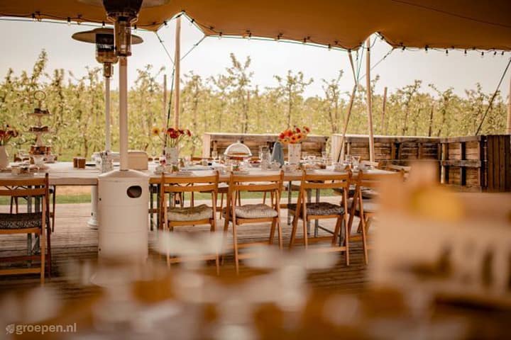 Altijd al willen slapen in een boomgaard? Deze vakantiewoning voor 16 overnachters en 8 slaapkamers ligt midden in een boomgaard.