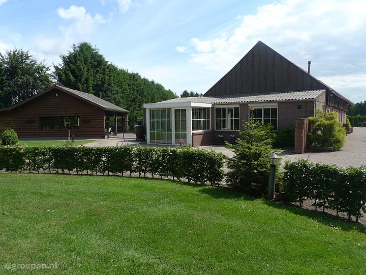 Er is voor de groep een compleet ingerichte keuken. Verder is er een eet/recreatiekamer met tv, stereo-installatie, sfeerhaard, poolbiljart, tafelvoetbal, elektronisch dart en sjoelbak. In totaal zijn er 10 slaapkamers waarvan 5 met sanitair op de kamer. De groepsaccommodatie is ook zeer geschikt voor mensen met een beperking, er is aangepast sanitair en hoog/laag bedden zijn aanwezig (informeer bij Groepen.nl naar de mogelijkheden). Er is een speciaal keukenblokje en een grote sanitaire ruimte voor personen met een beperking. Een linnenpakket is desgewenst te huur. Catering is mogelijk. Buiten is een groot overdekt terras met tuintafels en stoelen, barbecue, tafeltennistafel, sportveld met volleybalnet, schommels, bolderkar en glijbaan. Over het terrein is een verhard wandel/fiets pad aangelegd, leuk voor de kinderen met fiets of skelter, maar ook handig voor rollator of rolstoel. Tevens is er een wasmachine en droger aanwezig.