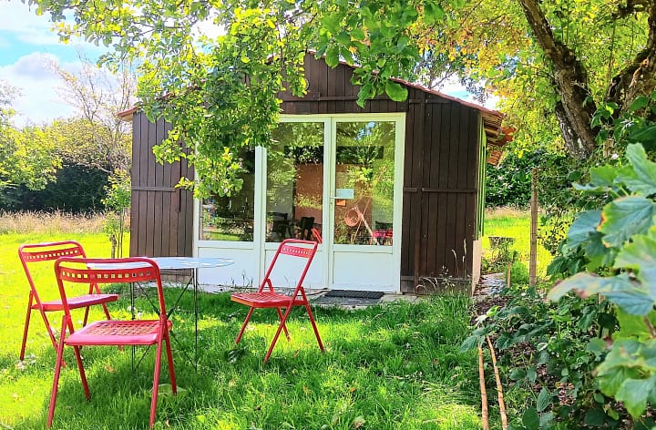 Midden in een boomgaard met volledige privacy. Back to basic, off grid ……Authentiek ingericht Tinyhouse woonkamer met tafel, en zithoek. Slaapkamer met 2 persoonsbed en wastafel. Heerlijk slapen onder het velux dakvenster de sterren zien, de nachtegaal horen , de boommarter en das bezig zien Keuken en sanitair zijn in gebouw op 40 meter.