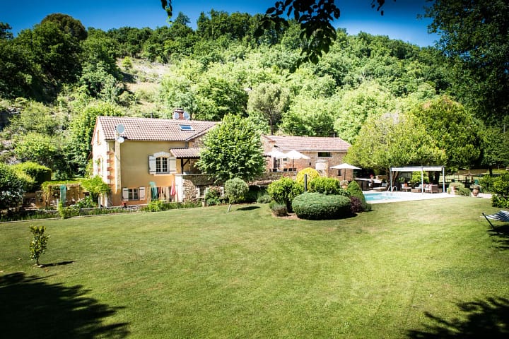 Er zijn 3 terrassen waarvan twee overdekt en één open naast het zwembad. Het open terras kijkt uit over de zwembadstroom en het zwembad in de grote tuinen op het zuiden. Er is een temperatuurgeregelde Weber barbecue om buiten te koken.