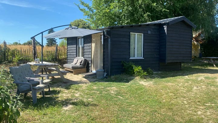 Een sfeervol chalet, volledig gerenoveerd, bovenaan de camping met een prachtig uitzicht over de camping en de landerijen.Indeling : woonkamer van 18 m2 met zithoek met granulé kachel, open, moderne keuken, en eettafel met stoelen. De woonkamer heeft openslaande deuren naar het zonnige terras. Verder is er 1 grote slaapkamer van 14m2 met in het midden de badkamer met douche, toilet en wastafel. In de slaapkamer staat 1 -2 persoonsbed van 1.80 bij 2 meter en aan de andere kant is een knusse slaaphoek met een stapelbed.