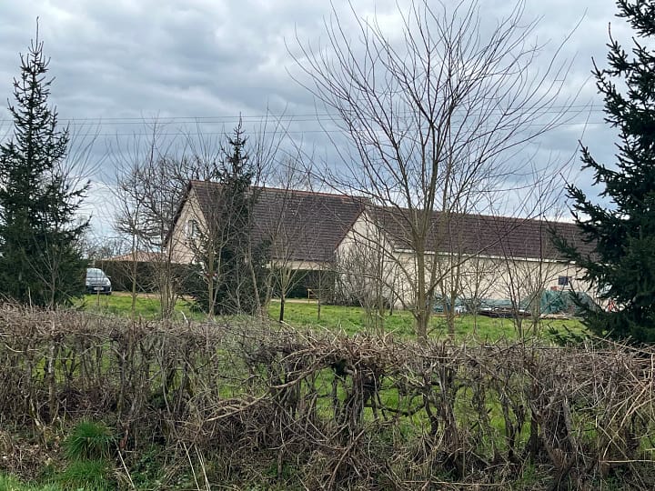 Gehele huis op één niveau, buiten met bomen, zwembad, terras, gasbarbecue.