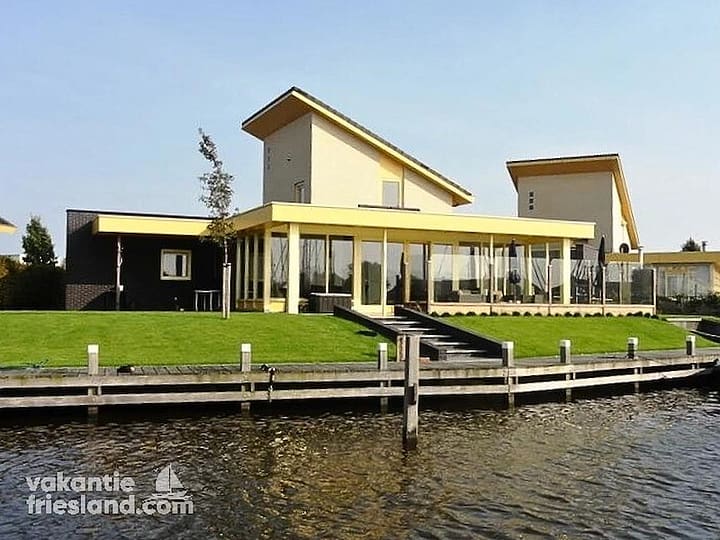 Deze schitterende vakantievilla staat op een kavel van ruim 600 m2. De entree van deze vakantievilla heeft een ruime hal. De grote woonkamer (50 m2) is met veel smaak en luxe ingericht en de grote raampartijen bieden een mooi uitzicht over het water. Ook de open keuken is van alle gemakken voorzien. De begane grond is volledig voorzien van vloerverwarming. Op de benedenverdieping is een royale slaapkamer met een tweepersoonsbed en een bijbehorende ruime badkamer met bad, douche en toilet. In de bijkeuken staat een wasmachine en een droger. Op de eerste verdieping zijn twee slaapkamers met twee stapelbedden (en een onderschuifbed) en een tweede badkamer. In de vakantiewoning kunnen maximaal acht mensen overnachten. Bij het huis is een ruime tuin, voorzien van een prachtig terras aan het water, een warme buitendouche en een privé steiger van 30 meter. Op het terras staat een heerlijke loungeset en een glazen windscherm. Lekker dus in de zon en uit de wind van uw welverdiende vakantie genieten, terwijl u uitkijkt op de jachthaven en het Johan Frisokanaal. De vakantiewoning is redelijk geschikt voor gehandicapte gasten, er is wifi, de woning is voorzien van rolluiken, windschermen en zonneschermen. Dus ook met warm weer, is het hier goed toeven. Er is voldoende parkeerruimte voor meerdere auto`s.