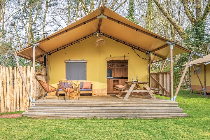 Stap binnen in de De Bos Tent, op een open veld waar het buitenleven centraal staat.