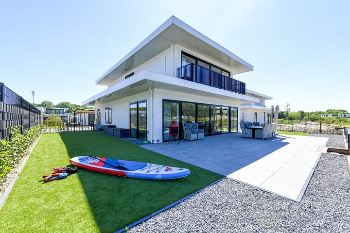 Kindvriendelijke 8-persoons villa aan het water met omheinde tuin, privésteiger, hottub, suppboards en een sfeervolle tuin met Kamado BBQ.