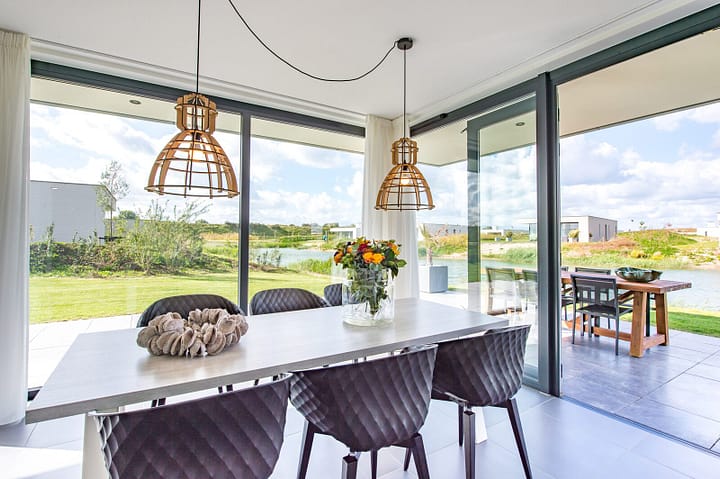 De sfeervolle woonkamer is heerlijk licht en door de glazen pui over de volle breedte van de living (floor to ceiling windows) kunt u genieten van de befaamde Zeeuwse luchten en zonsondergangen. Met de dubbele tuindeuren kunt u de woonkamer optimaal met de tuin verbinden. Naast een grote eettafel is er een royale zithoek met flatscreen TV met buitenlandpakket, soundbar en een sfeervolle gashaard. De luxe, open keuken is volledig uitgerust met moderne kwaliteitsapparatuur zoals een combi magnetron, vaatwasser en een Nespresso machine.