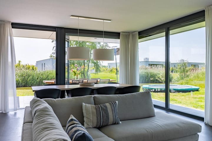 De sfeervolle woonkamer is heerlijk licht en door de glazen pui over de volle breedte van de living (floor to ceiling windows) kunt u genieten van het Zeeuwse licht. Door het openen van de tuindeuren verbindt u de woonkamer met het terras. In de living bevindt zich een comfortabele zithoek met sfeervolle gashaard en flatscreen TV. Een grote eettafel nodigt uit tot gezellig tafelen.