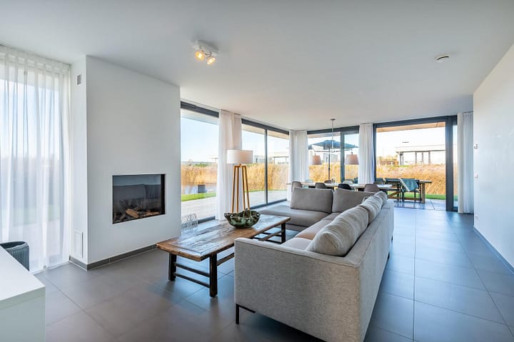 De sfeervolle woonkamer is heerlijk licht en door de glazen pui over de volle breedte van de living (floor to ceiling windows) kunt u genieten van de befaamde Zeeuwse luchten en zonsondergangen. Met de dubbele tuindeuren kunt u de woonkamer optimaal met de tuin verbinden. Naast een grote eettafel is er een royale zithoek met flatscreen TV met buitenlandpakket en een sfeervolle gashaard.