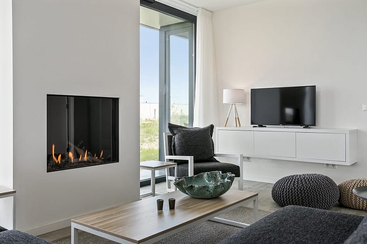 Als u de tuindeuren in de woonkamer opent naar het extra royale terras met glazen windscherm, kunt u direct van het buitenleven genieten. U vindt hier een grote design picknick tafel en twee comfortabele ligbedden. De royale tuin grenst aan een waterpartij en wordt omringd door glooiingen, helmgras en duinstruweel. Door de ligging op het zuiden vindt u hier altijd een heerlijke plek in de zon.