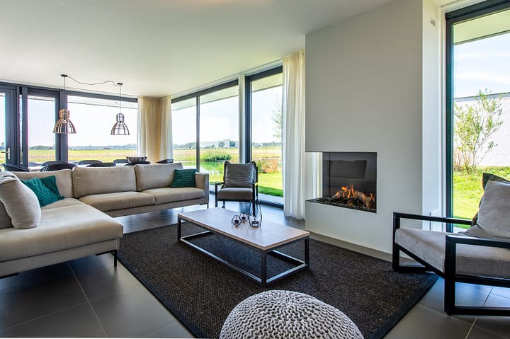 De sfeervolle woonkamer is heerlijk licht en door de volledig glazen pui over de volle breedte van de living (floor to ceiling windows) heeft u een panoramisch uitzicht over het weidse polderlandschap. Met de dubbele tuindeuren kunt u de woonkamer optimaal met de tuin verbinden. Naast een grote eettafel is er een royale zithoek met flatscreen TV met buitenlandpakket en een sfeervolle gashaard. De luxe, open keuken is volledig uitgerust met moderne kwaliteitsapparatuur, zoals een combi magnetron, vaatwasser en een Nespresso machine.