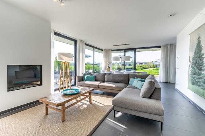 De sfeervolle woonkamer is heerlijk licht en door de glazen pui over de volle breedte van de living (floor to ceiling windows) kunt u genieten van de befaamde Zeeuwse luchten en zonsondergangen. Met de dubbele tuindeuren kunt u de woonkamer optimaal met de tuin verbinden. Naast een grote eettafel is er een royale zithoek met flatscreen TV met buitenlandpakket en een sfeervolle gashaard. De raampartijen zijn aan de buitenzijde voorzien van elektrisch bedienbare screens.
